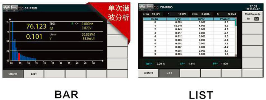 IT8600提供了大的數(shù)據(jù)量測(cè)功能,除了可以測(cè)量常規(guī)的Vrms、Vpk、Vdc、Irms、Ipk、Idc、W、VA、VAR、CF、PF、Freq等參數(shù)外,提供的電壓諧波分析功能,以驗(yàn)證待測(cè)物(不間斷電源UPS,發(fā)電機(jī)等)。對(duì)于電網(wǎng)的諧波干擾,具有50次電壓諧波的分析功能,并且可以以不同形式顯示各次諧波所占百分比的分析結(jié)果。