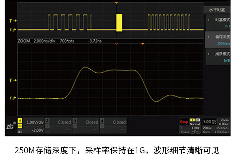 如果存儲(chǔ)深度能夠做到足夠大,就能保持較高的波形采樣率,則觀察到的波形會(huì)真實(shí)、細(xì)膩。反之,如果存儲(chǔ)深度只有1Mpts甚至低,當(dāng)要觀察時(shí)長較大的波形時(shí),示波器就只能被迫降低采樣率。由于采樣點(diǎn)數(shù)不足,示波器顯示的波形也會(huì)嚴(yán)重失真,甚至產(chǎn)生波形混疊,誤導(dǎo)用戶測量分析。ZDS3000/2000B系列示波器創(chuàng)新性地采用DDR3存儲(chǔ)技術(shù),配合大規(guī)模的FPGA器件,通過全硬件加速和多線程并行處理,存儲(chǔ)深度高可達(dá)250M !在觀察長時(shí)間波形時(shí)也不丟失波形細(xì)節(jié)。