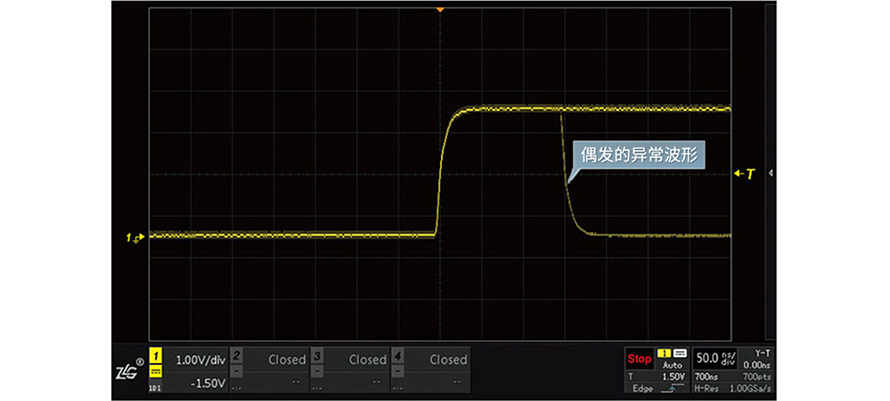 在調(diào)試信號(hào)波形時(shí),我們需要明確信號(hào)是否出現(xiàn)了異常。如果出現(xiàn)了異常,那這些異常信號(hào)出現(xiàn)的頻率是多少,是不是周期性出現(xiàn)的呢?為了弄清楚這些問題,一般需要長時(shí)間記錄波形,然后基于這樣一個(gè)龐大的波形數(shù)據(jù)庫去定位異常波形出現(xiàn)的位置。ZDS3000/2000B系列示波器依托于海量存儲(chǔ)和硬件加速的優(yōu)勢,能夠從數(shù)十萬個(gè)波形中迅速定位出感興趣的信號(hào),只要當(dāng)前屏幕內(nèi)出現(xiàn)了符合搜索條件的波形信號(hào),系統(tǒng)都將自動(dòng)地在對(duì)應(yīng)位置做上標(biāo)記,異常信號(hào)一覽無余。