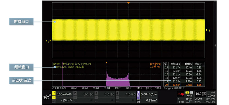 市面上多數(shù)2000系列示波器MAX只支持8K樣本點(diǎn)的FFT分析,在1G采樣率的情況下,頻率分辨率有125KHz,多數(shù)情況都無法準(zhǔn)確判斷信號(hào)頻譜分布。ZDS3000/2000B系列示波器拒絕單純的功能堆砌,內(nèi)部采用了專業(yè)的處理芯片,將FFT分析點(diǎn)數(shù)升級(jí)至4M樣本點(diǎn),同樣在1G采樣率的情況下頻率分辨率能準(zhǔn)確到250Hz,可以準(zhǔn)確分析出電路中的干擾噪聲來源,大大提高了示波器FFT的實(shí)用價(jià)值。4Mpts FFT分析功能,不僅僅是在量上突破,而且還是在質(zhì)上的飛躍。