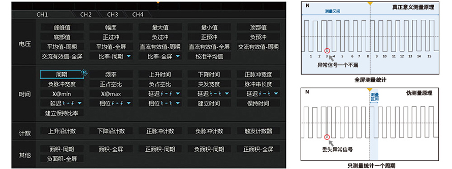 僅僅通過波形的直觀表現(xiàn)來分析波形遠(yuǎn)遠(yuǎn)不夠,只有將波形各項(xiàng)指標(biāo)量化,才能看透波形異常的本質(zhì)。然而受限于架構(gòu)和芯片限制,絕大多數(shù)示波器的參數(shù)測量都是基于采樣結(jié)果進(jìn)行抽點(diǎn),無論屏幕中有多少個(gè)信號(hào)周期,都僅僅抽取每屏中的一個(gè)周期信號(hào)進(jìn)行統(tǒng)計(jì)測量,這也直接導(dǎo)致了結(jié)果的嚴(yán)重失真。為了實(shí)現(xiàn)意義的參數(shù)測量統(tǒng)計(jì),我們采用FPGA進(jìn)行全硬件加速,通過對(duì)屏幕上每一個(gè)周期信號(hào)的測量,計(jì)算出每一項(xiàng)指標(biāo)的MAX值,MIN值,平均值,標(biāo)準(zhǔn)差,實(shí)現(xiàn)了意義參數(shù)測量功能,并且多達(dá)50余種。