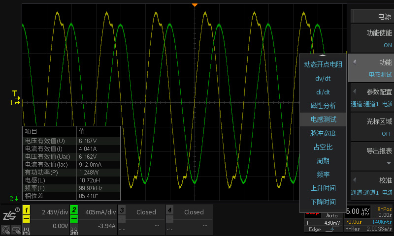 開關(guān)電源的質(zhì)量直接影響到產(chǎn)品的技術(shù)性能以及其安全性和可靠性。電源測試項(xiàng)目多,計(jì)算量大,統(tǒng)計(jì)繁瑣等問題一直困擾著工程師們,為了解決這些問題,致遠(yuǎn)電子在示波器中增加開關(guān)損耗、SOA、電感測試等電源分析功能。如在電感測試功能中可直接對(duì)電感、有功功率等項(xiàng)目進(jìn)行計(jì)算,方便工程師快速、準(zhǔn)確地測試電源產(chǎn)品。