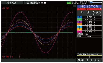 非掃描式的信號采樣方式,所有通道均有各自的A/D轉(zhuǎn)換器,通道間無時(shí)間差,實(shí)現(xiàn)了全通道同時(shí)測量,特別適合于測量高速電壓波動和振動等現(xiàn)象。